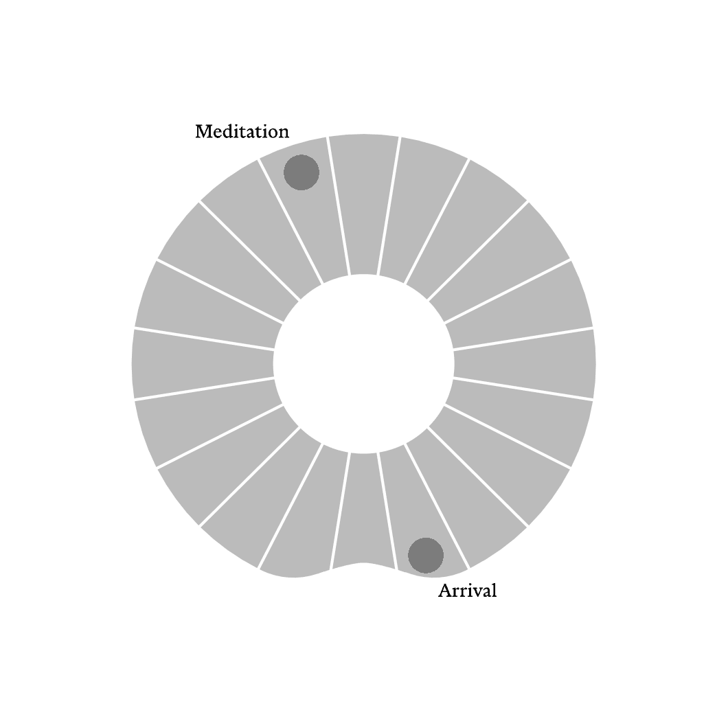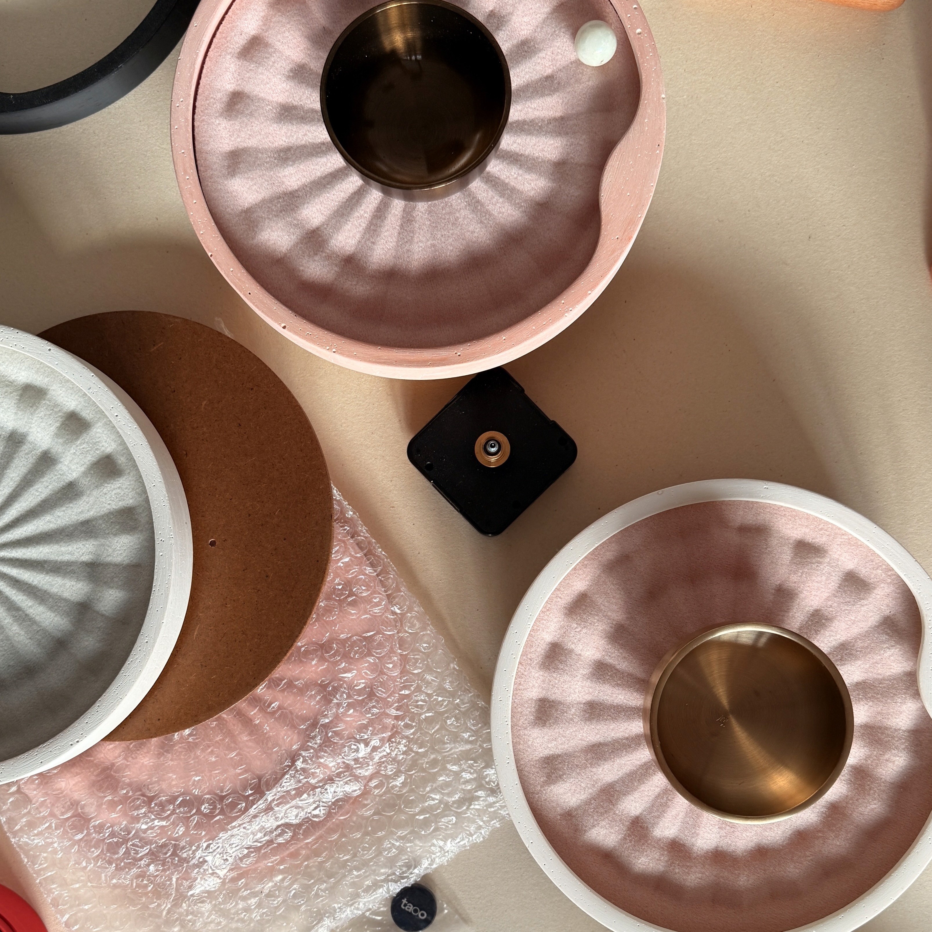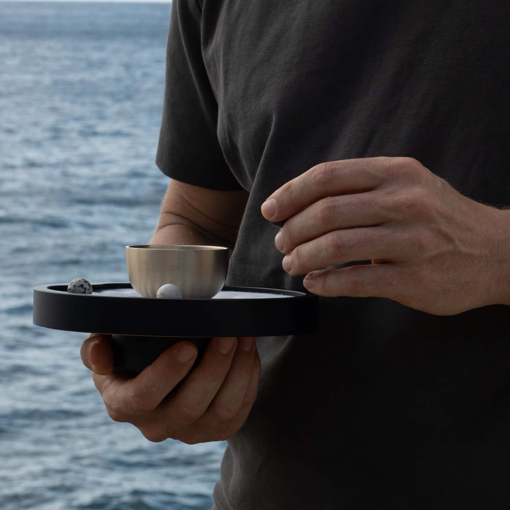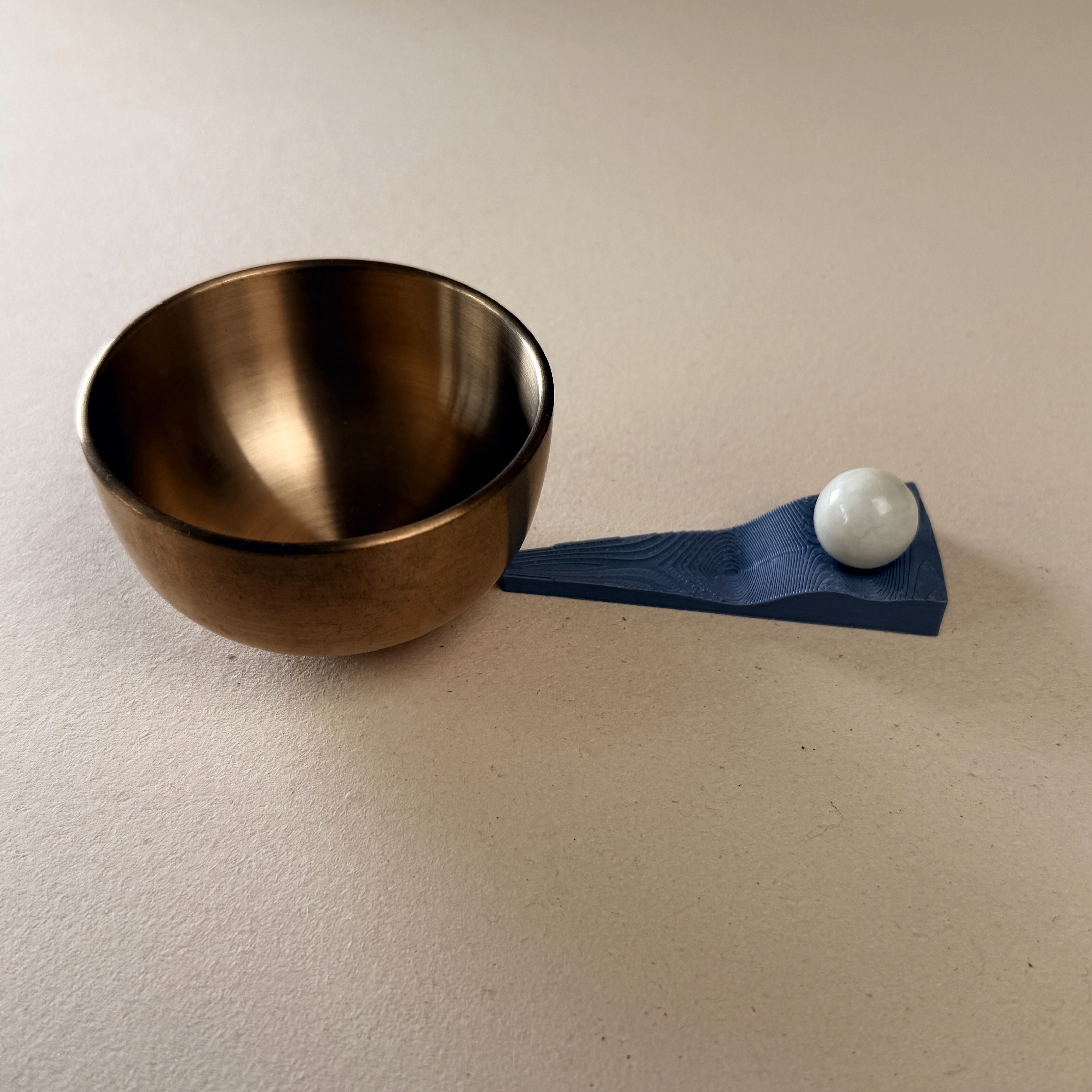 TAOO is a kinetic meditation timer. You place marbles on a slowly rotating disc — one for each moment you want to mark. As the disc turns, each marble eventually reaches its tipping point, rolls inward, and gently strikes the singing bowl. No countdown. No screen. Just the quiet geometry of time, made visible.